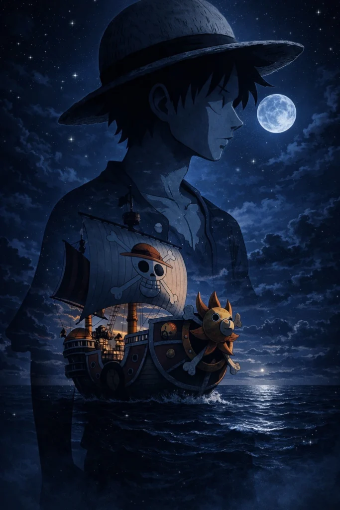 Download this beautiful Luffy 4K night wallpaper, where the Thousand Sunny sails quietly beneath a glowing moon. The deep blue sky, soft ocean light, and peaceful atmosphere give it a calm, cinematic feel. Perfect for One Piece fans who want a high quality, ultra HD background for their desktop or mobile screen.